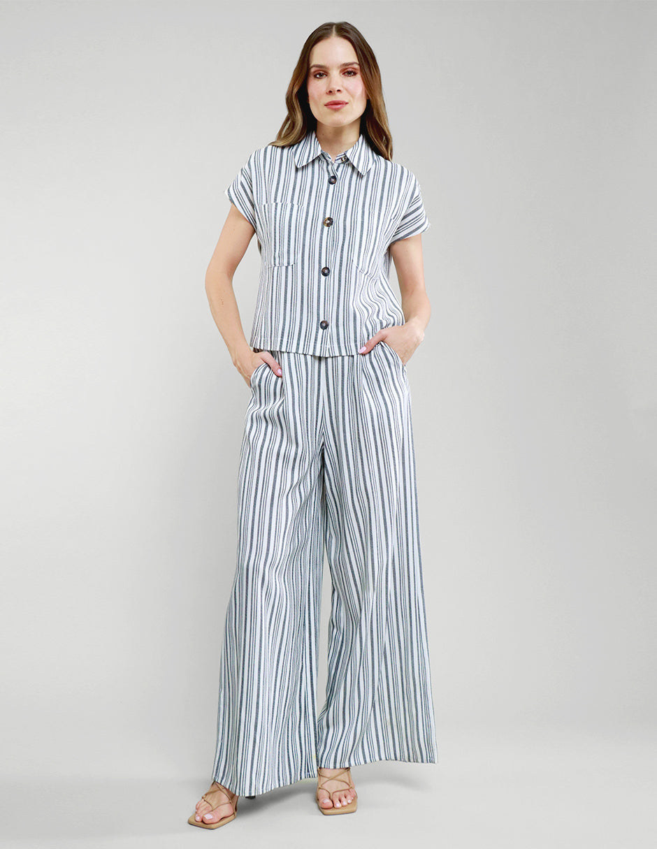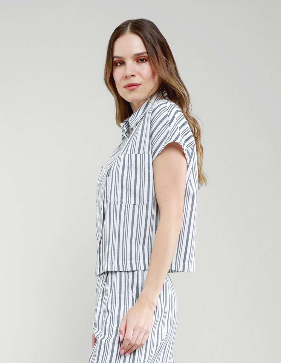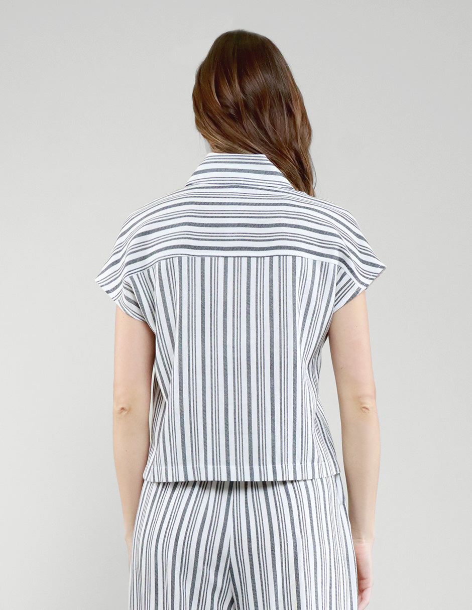 Chaleco con cuello camisero, aletilla al frente con botones, canesú en espalda, hombro caído y bolsas al frente