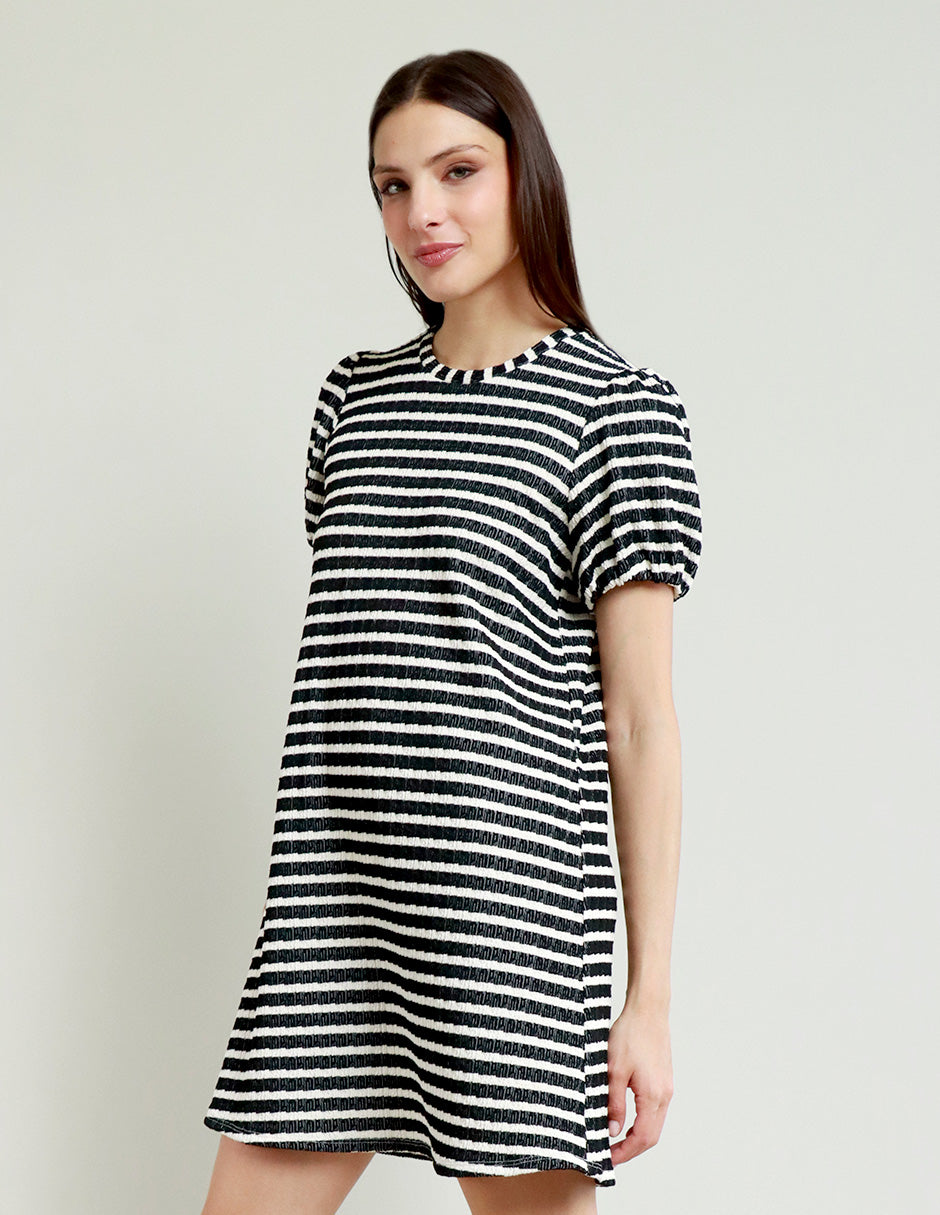Vestido corto a rayas con cuello redondo y manga globo